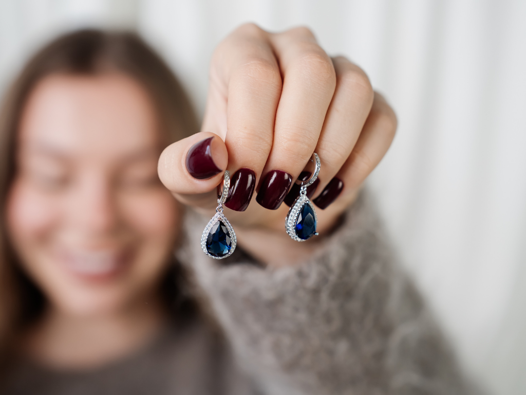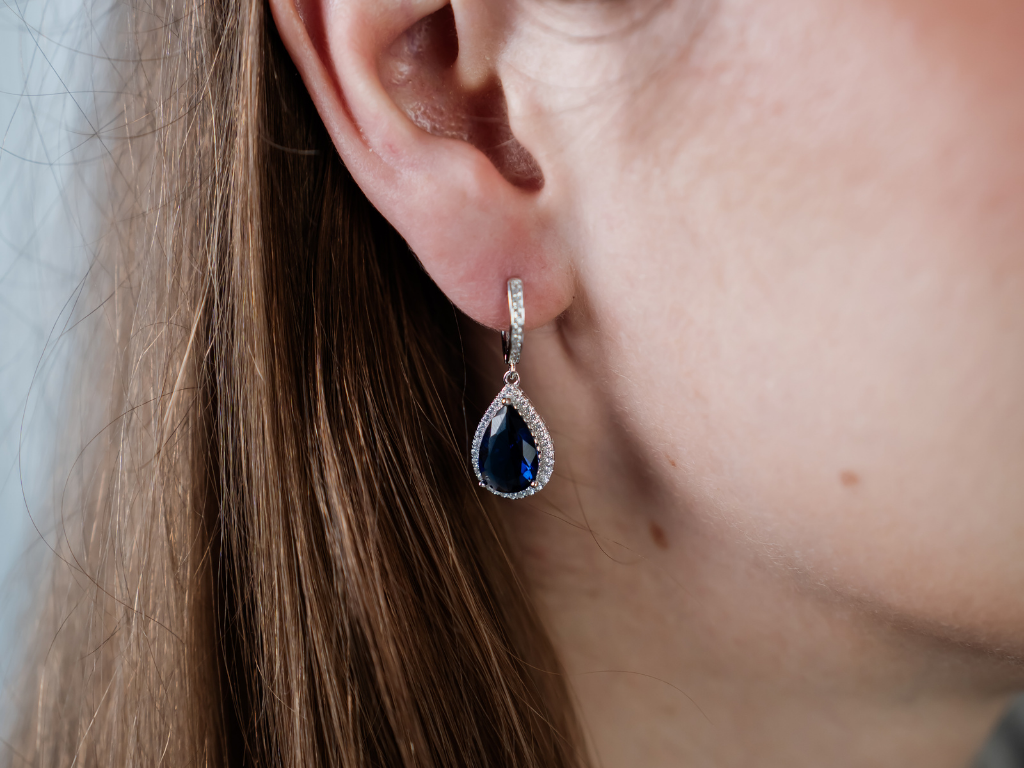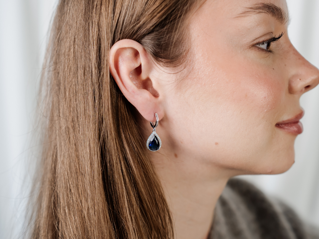 Stříbrné visací náušnice s tmavě modrým skleněným kamenem.