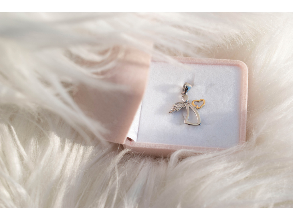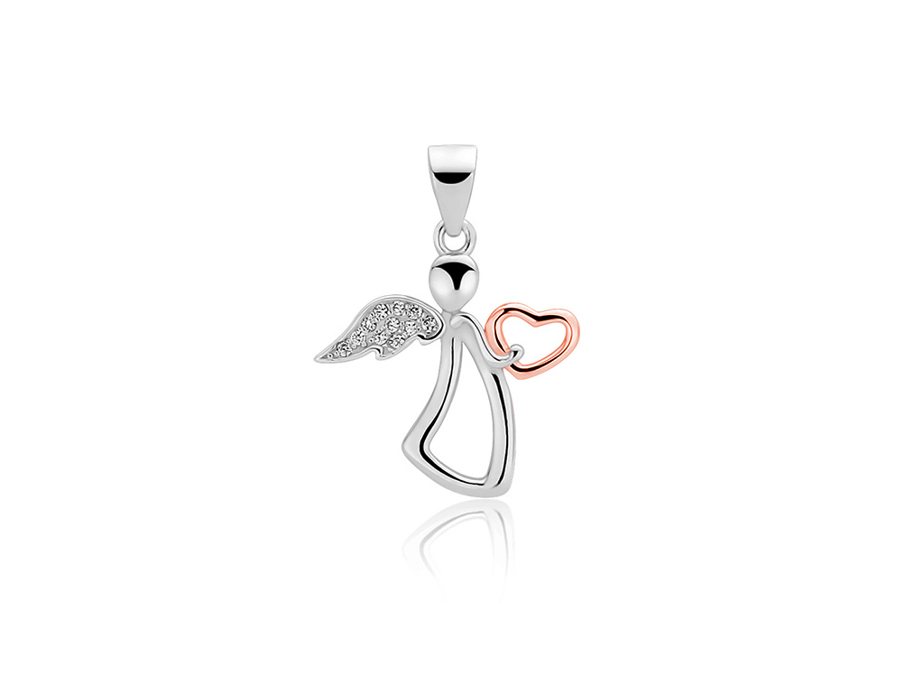 Stříbrný přívěsek ANDĚL se růžovým srdíčkem. Srdíčko je pozlacené 18K růžovým zlatem. Rozměry přívěsku bez očka: 18 mm x 18 mm. Průměr očka pro řetízek je 3 mm. Zirkony jsou vsazené. Přívěsek je vyrobený ze stříbra 925/1000 a je označený puncem ryzosti.