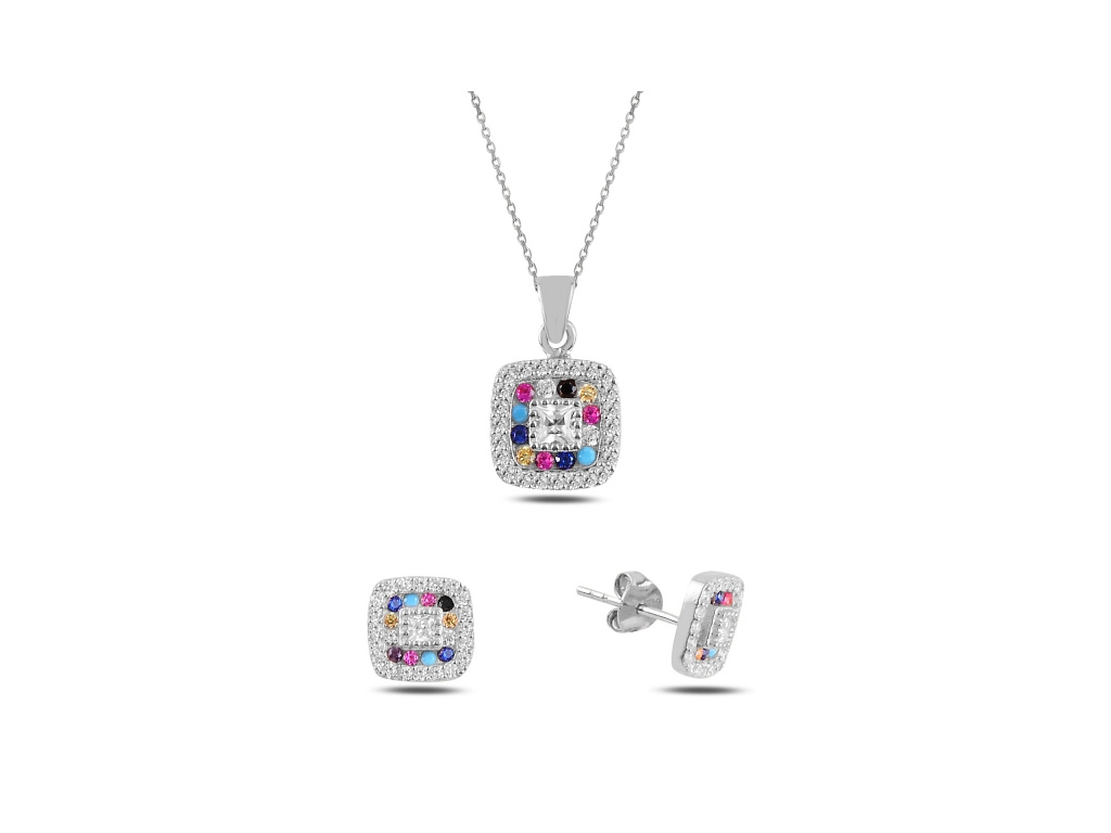 Stříbrný přívěsek i náušnice obsahují barevné i čiré zirkony.