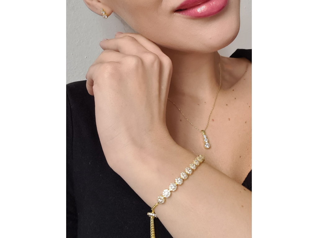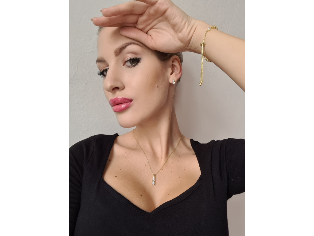 Pozlacená sada šperků je vyrobená ze stříbra 925/1000 a je označená puncem ryzosti. Řetízek má délku 43 cm, délka náušnic je 1,1 cm. Sada je zdobená čirými zirkony.