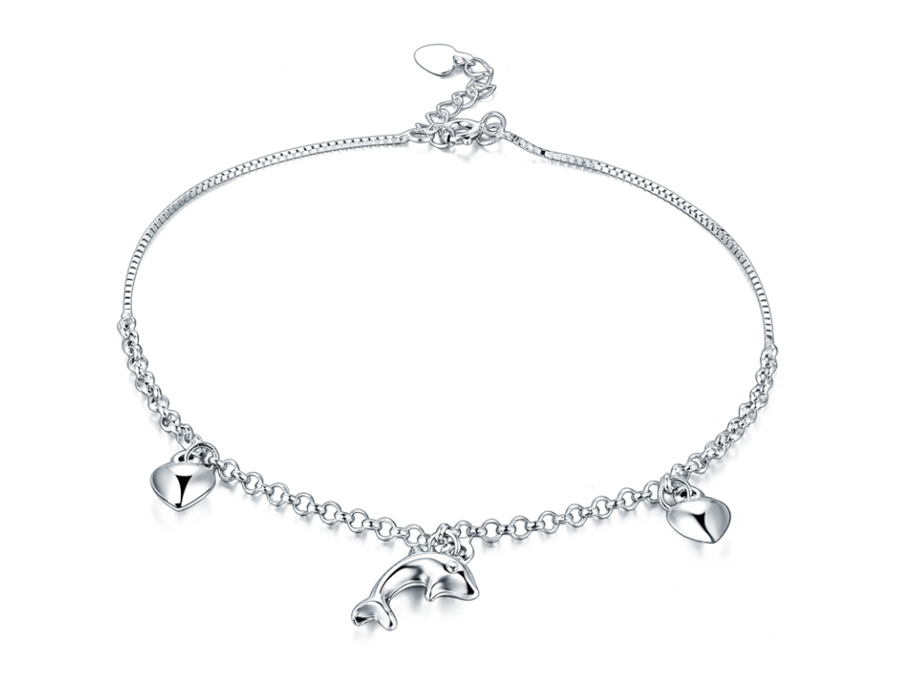 Extra dlouhý stříbrný řetízek na nohu má nastavitelnou délku od 23 cm až do 28 cm. Zdobí ho malý delfín a dvě srdíčka. Řetízek na nohu je vyrobený ze stříbra ryzosti 925/1000 a je označený puncem.
