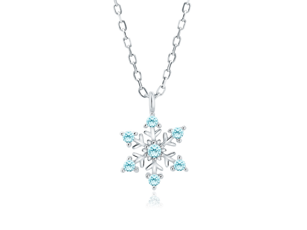 Rhodiovaný stříbrný náhrdelník s motivem sněhové vločky s modrými zirkony.