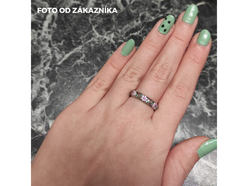 - Růžové květy se zelenými lístečky po celém obvodu prstenu.
