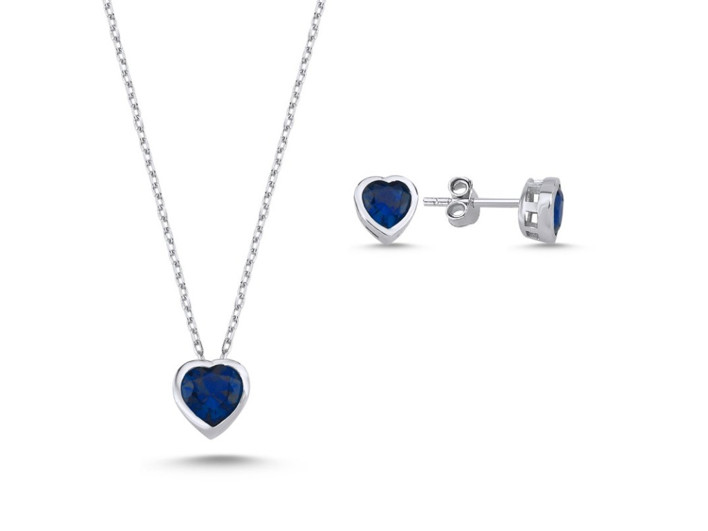 Stříbrný přívěsek i náušnice mají vsazené modré zirkony ve tvaru srdce.