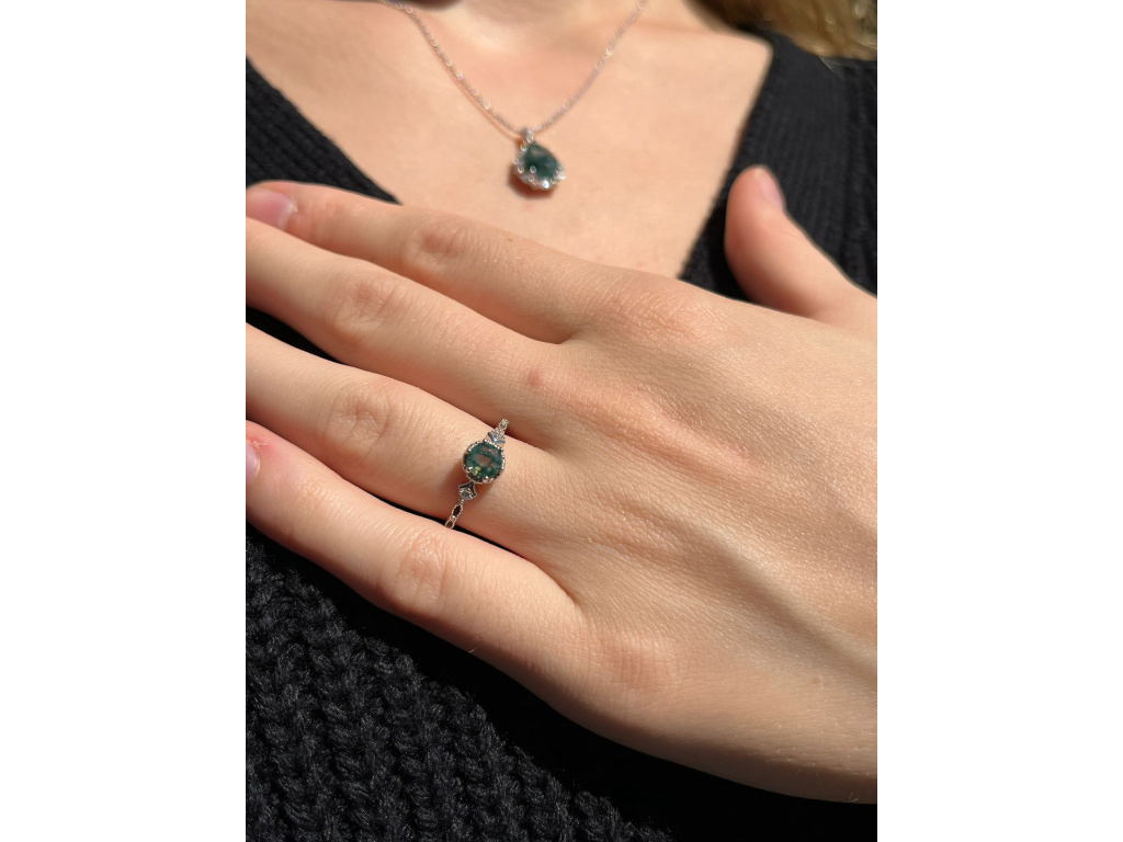 Parametry: průměr korálků 8 mm; délka 18 cm; bez stříbrných komponentů; celková hmotnost ≤16,5 g. - Stříbrný prsten MECHOVÝ ACHÁT – centrální kámen ⌀ 6 mm doplňují drobné čiré zirkony po stranách; nadčasová elegance do každého dne.