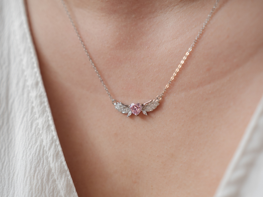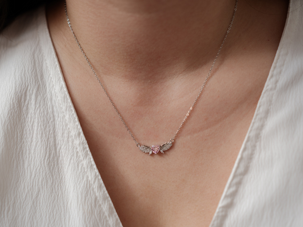 Stříbrný náhrdelník SRDCE ANDĚLA má nastavitelnou délku řetízku od 40 cm do 45 cm. Ve středu přívěsku je růžový zirkon a andělská křídla jsou posetá čirými zirkony. Náhrdelník je rhodiovaný, vyrobený ze stříbra ryzosti 925/1000.
