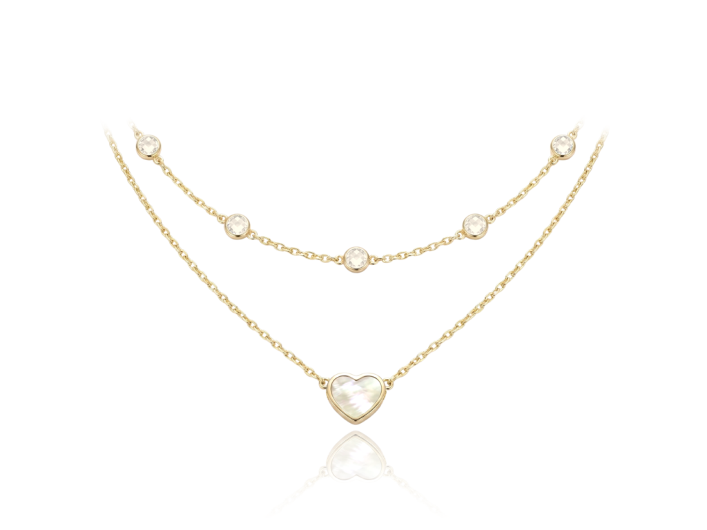 MINET Dvojitý zlatý náhrdelník srdíčko s bílou perletí a bílými zirkony Au 585/1000