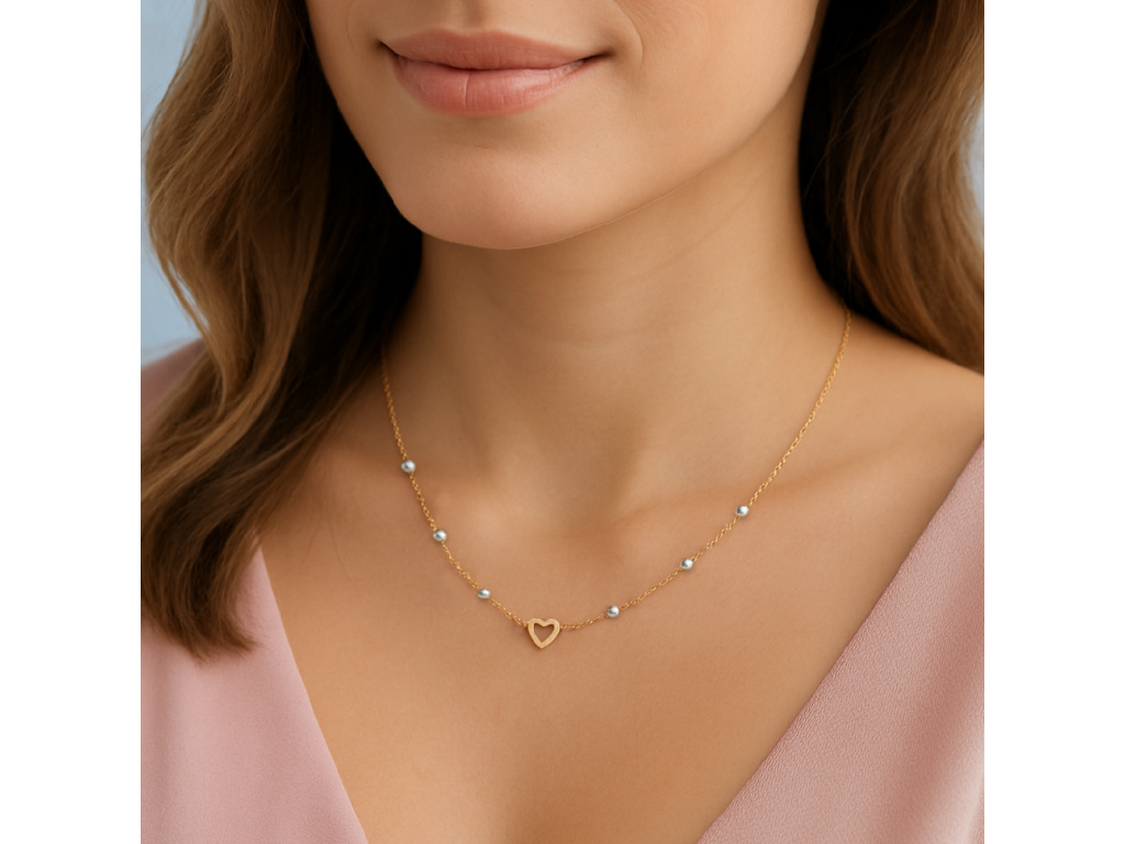 Zlatý náhrdelník srdíčko a kuličky v kombinaci bílého a žlutého zlata Au 585/1000