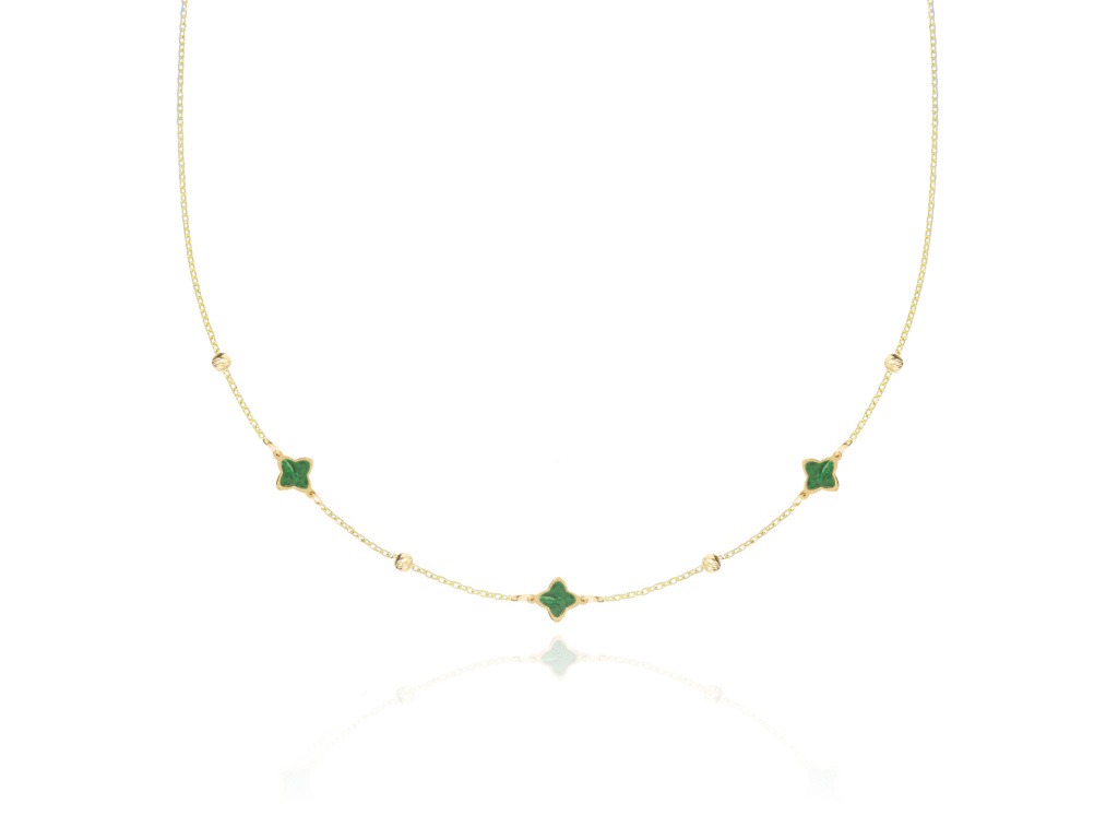 Tento dámský náhrdelník je vyroben z kvalitního žlutého zlata ryzosti 585/1000 a zaujme svým čistým a harmonickým designem. Dominantou je decentní přívěsek osazený syntetickým malachitem, jehož charakteristická zelená barva symbolizuje rovnováhu, energii a klid.