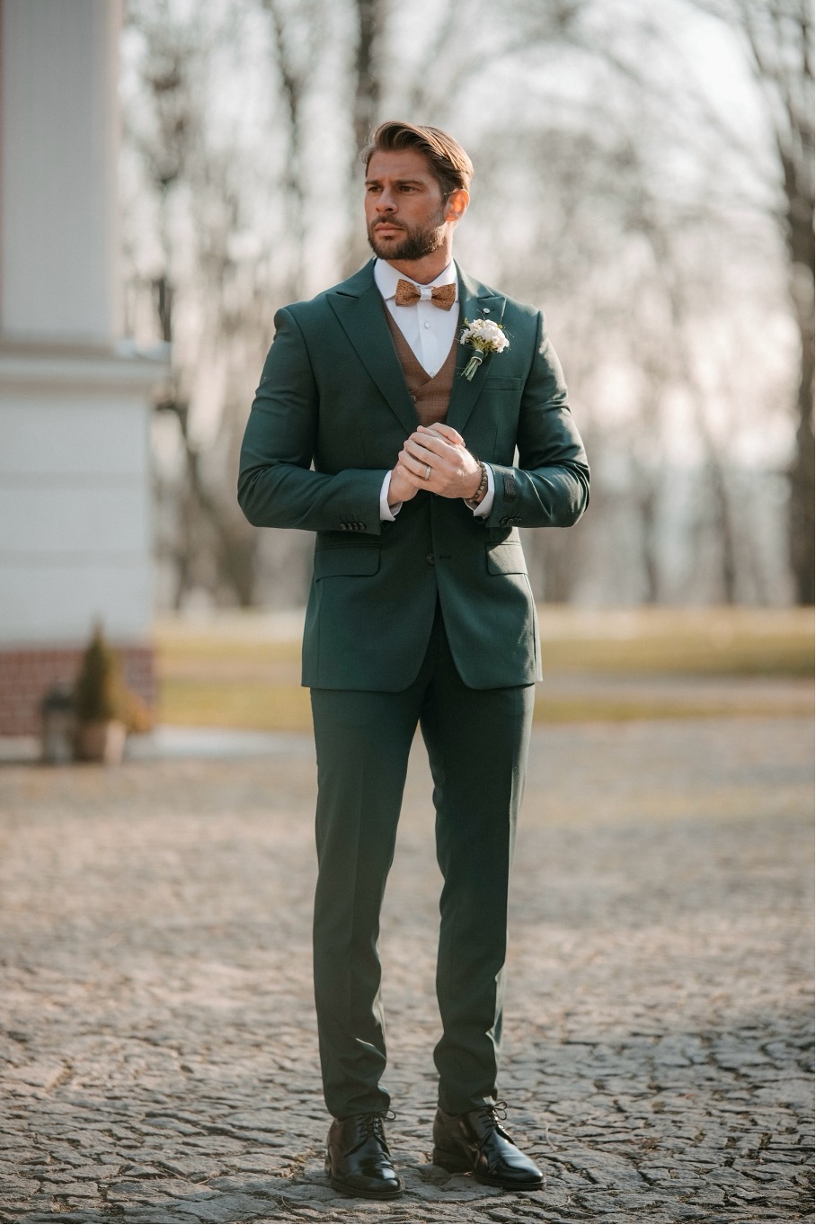 Nezapomínejte ani na šaty nevěsty – právě jejich střih, styl a materiál by měl být pro ženicha vodítkem při výběru obleku. K romantickým šatům s krajkou se skvěle hodí klasický tmavý oblek s hedvábnými doplňky, zatímco k minimalistickým šatům vynikne jednoduchý oblek s čistými liniemi. Pokud má nevěsta boho nebo vintage model, může si ženich dovolit i látky s texturou, zajímavější odstíny nebo jemný vzor.